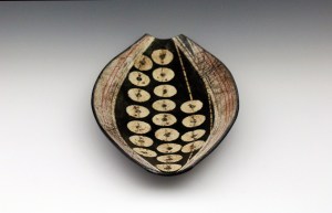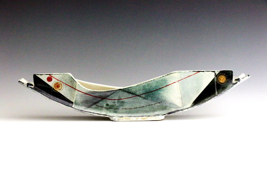 A continuing series, Tides are my response to an environment changing faster than we comprehend, poetic interpretations in clay of Hokusai’s great woodcut. Gold decals of setting suns are overlaid with Rachel Carson’s quotes or Billy Collins’ great lines from The Art of Drowning: “The tide will take you, or the lake will accept it all as you sink toward the weedy disarray of the bottom, leaving behind what you have already forgotten . . . .” Both forms and words refer to the rising seas that submerge every coastline of every continent.